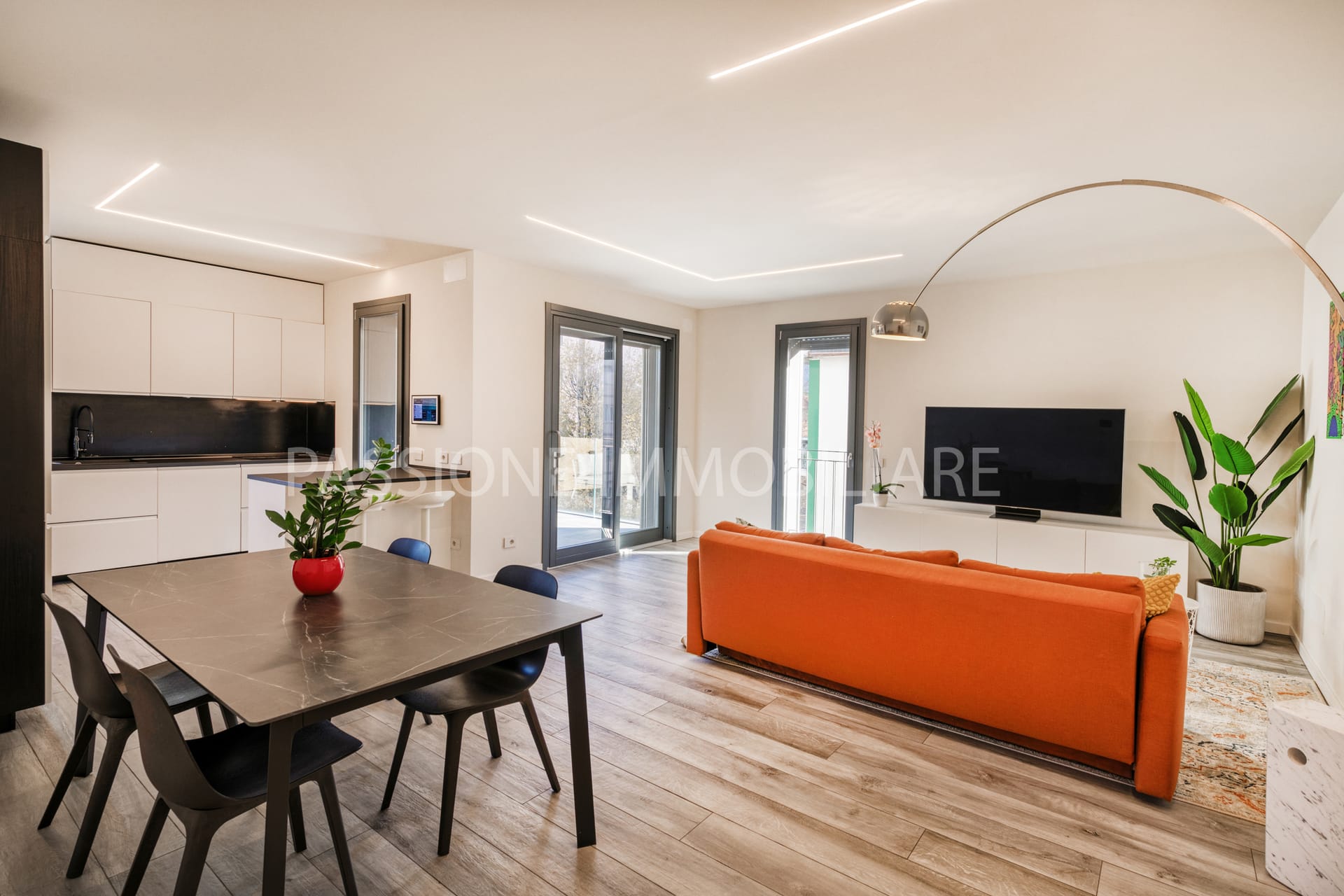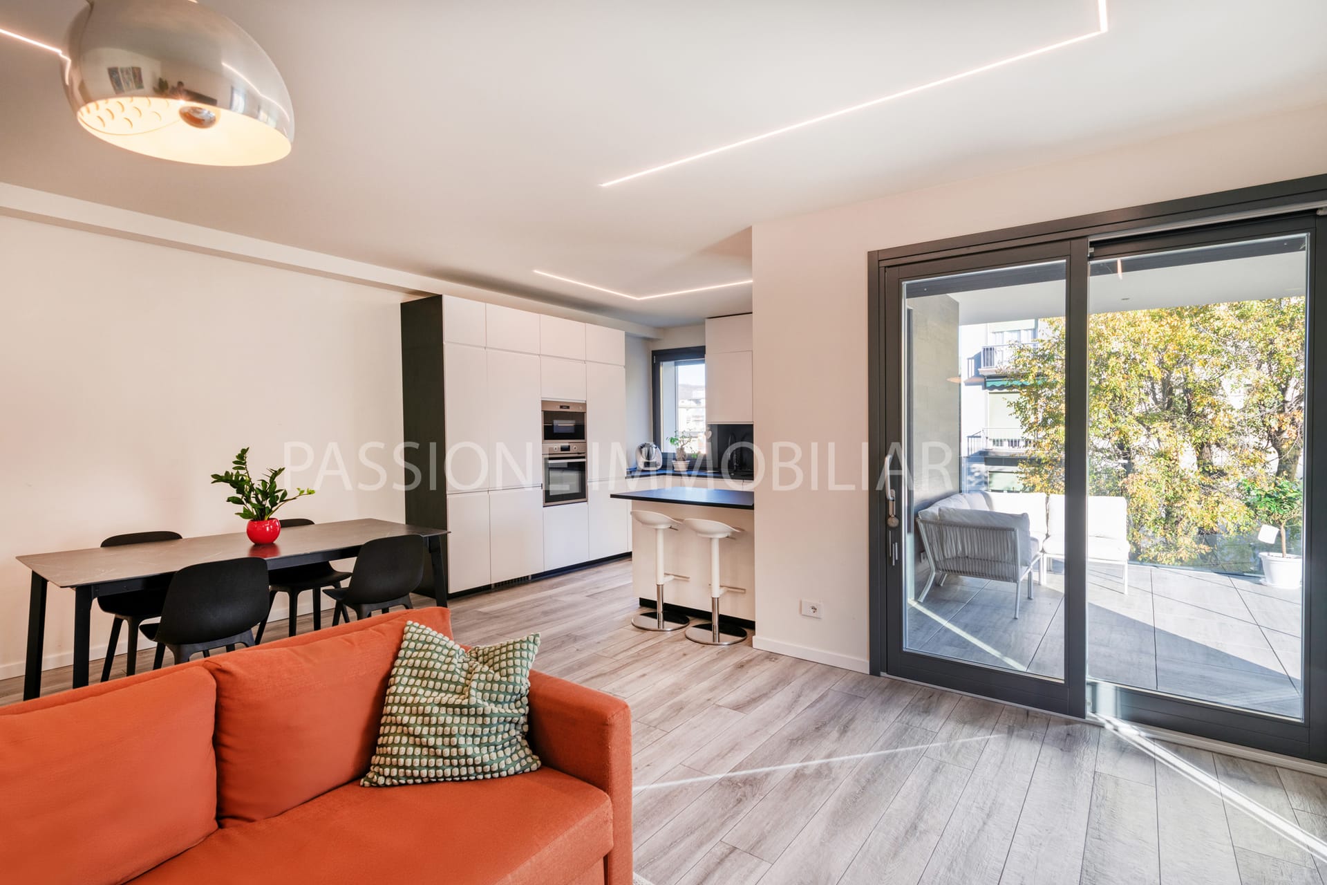 La zona giorno si presenta fin da subito come un ambiente armonioso e ricco di luce naturale. L’ampio living a pianta aperta, caratterizzato da finiture moderne e da una cucina a vista perfettamente integrata, offre uno spazio conviviale ideale sia per la vita quotidiana che per momenti di ospitalità. Questo ambiente si estende all’esterno grazie alla COMODA TERRAZZA, un piacevole angolo all’aperto perfetto per colazioni, aperitivi o semplicemente per godere della tranquillità della zona.