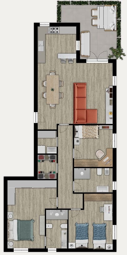La ZONA NOTTE è stata progettata con particolare attenzione al comfort e alla privacy. Ospita una CAMERA MATRIMONIALE CON BAGNO PADRONALE, elegante e ben rifinito, ideale come suite personale; una seconda camera matrimoniale, altrettanto luminosa e spaziosa; e una terza camera di dimensioni più contenute, perfetta come stanza per bambini, studio o camera per gli ospiti. Un SECONDO BAGNO, funzionale e ben organizzato, serve le restanti stanze.
