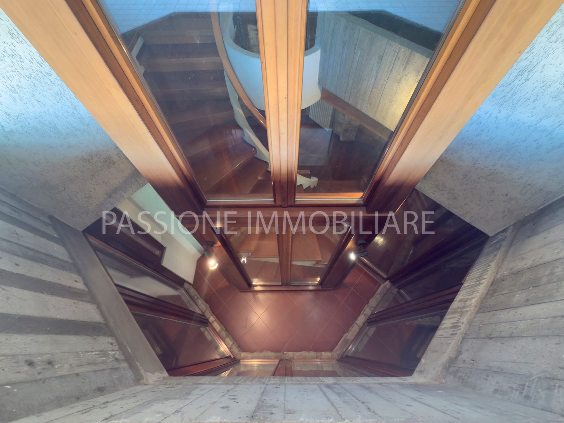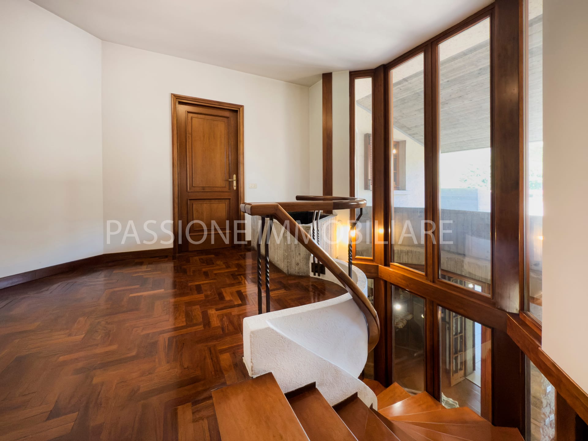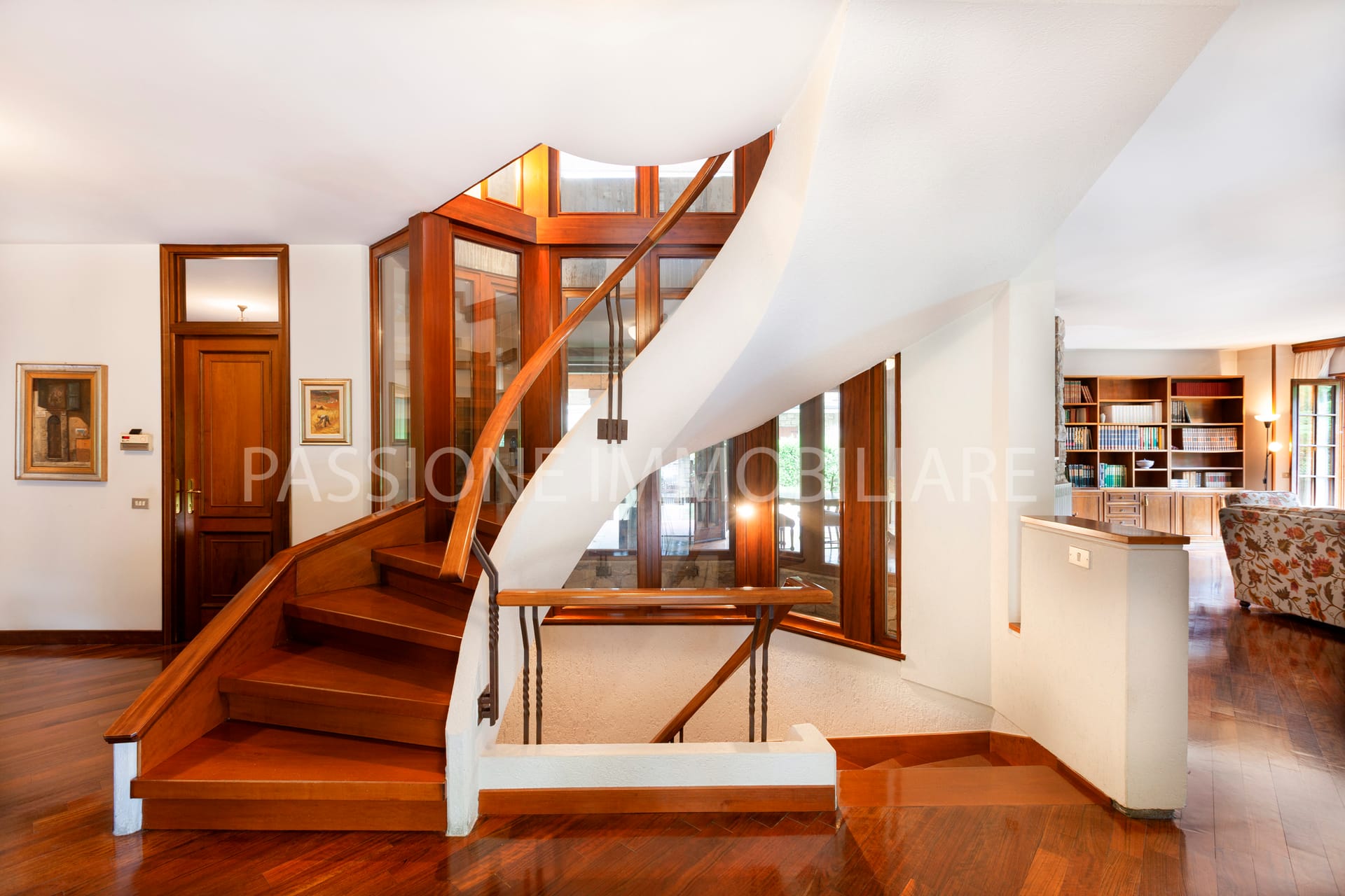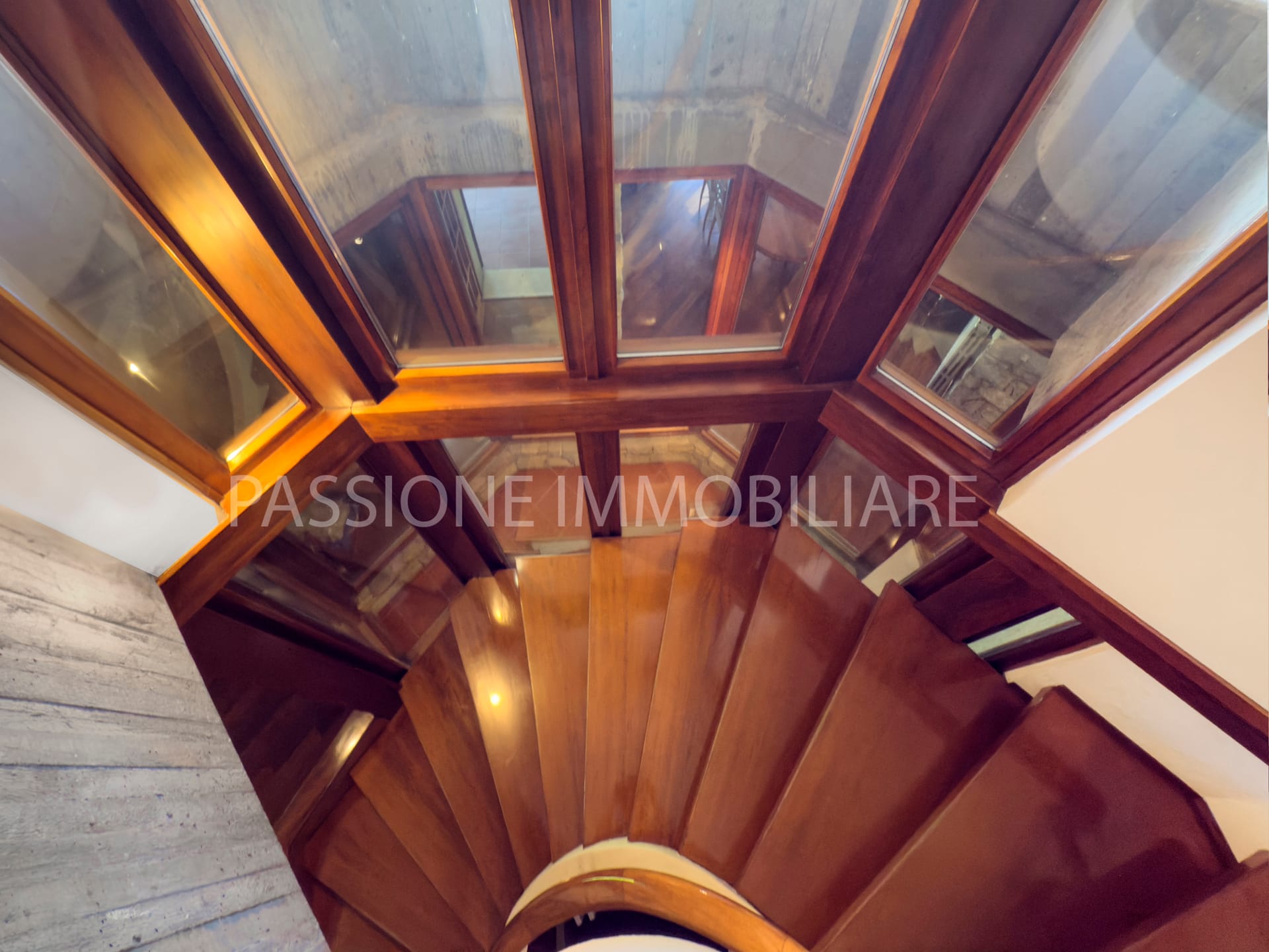 Distribuita su tre livelli, la proprietà è attraversata da una SCENOGRAFICA SCALA IN LEGNO incorniciata da ampie vetrate, che donano una luminosità calda e naturale agli ambienti interni.