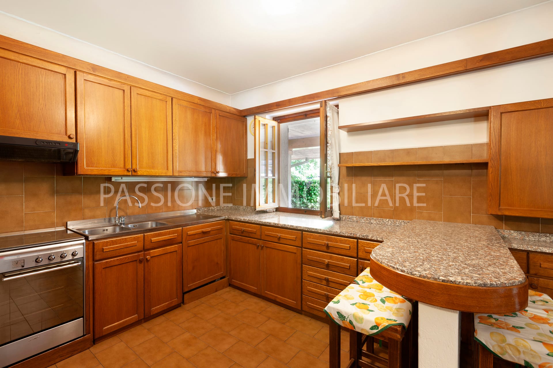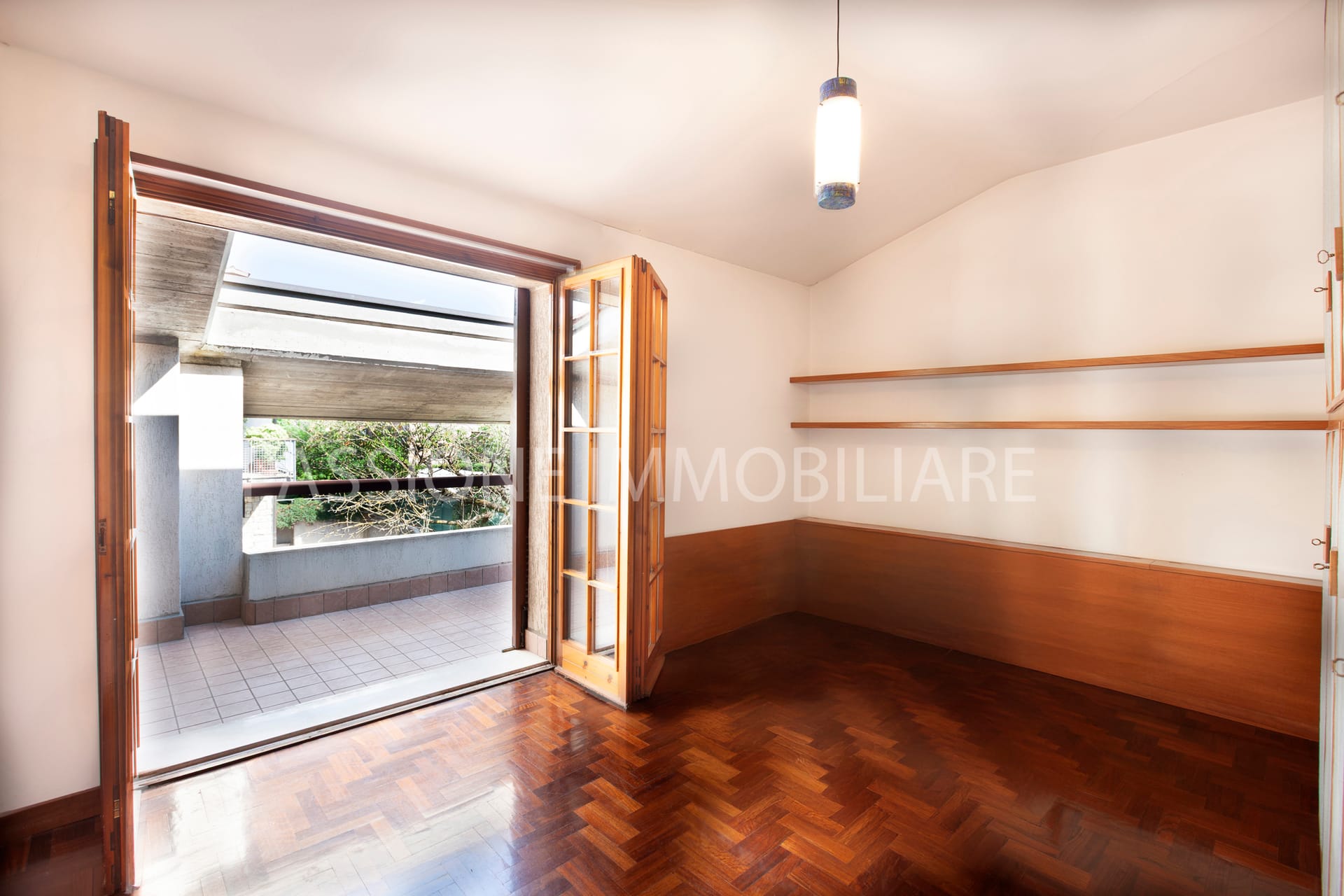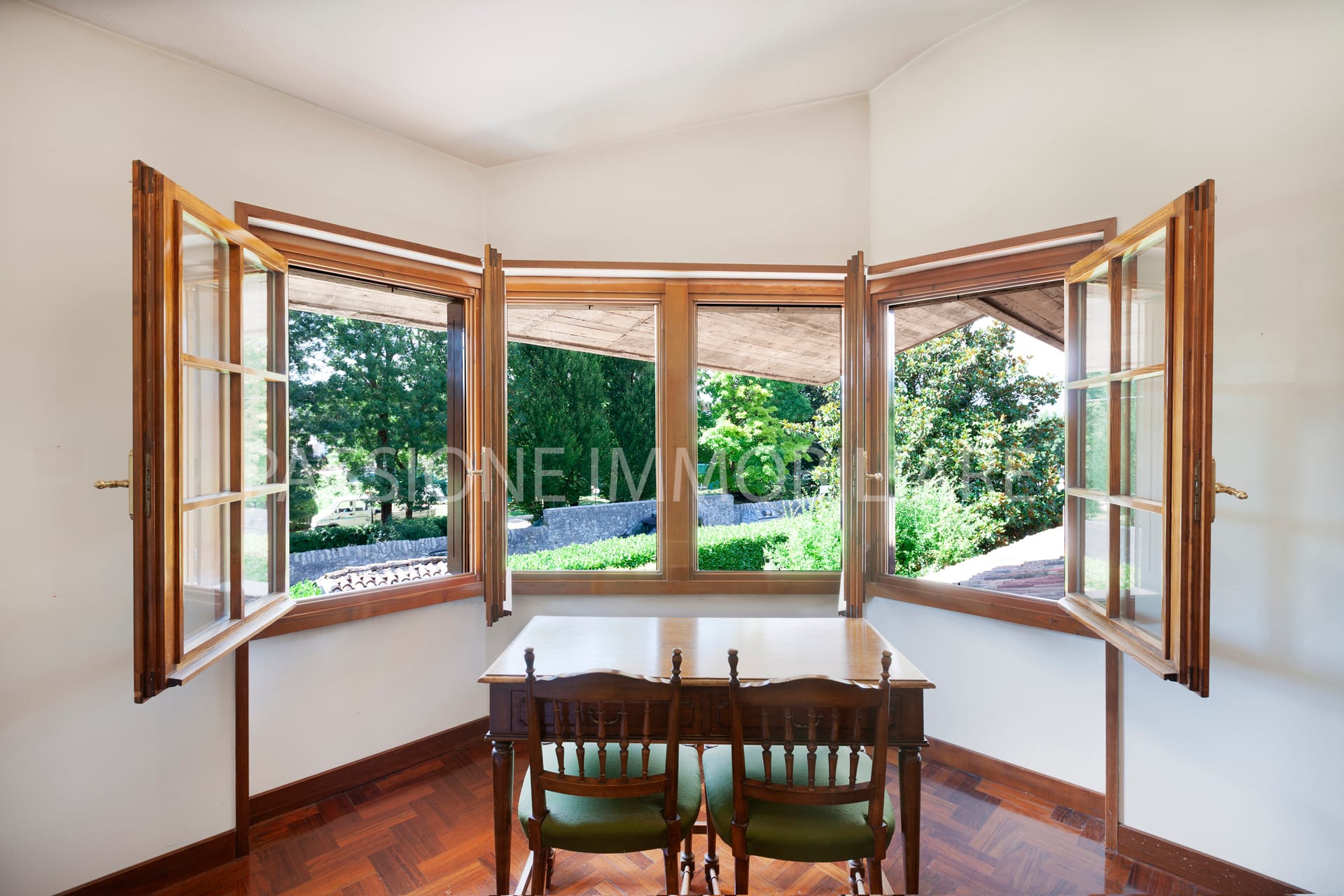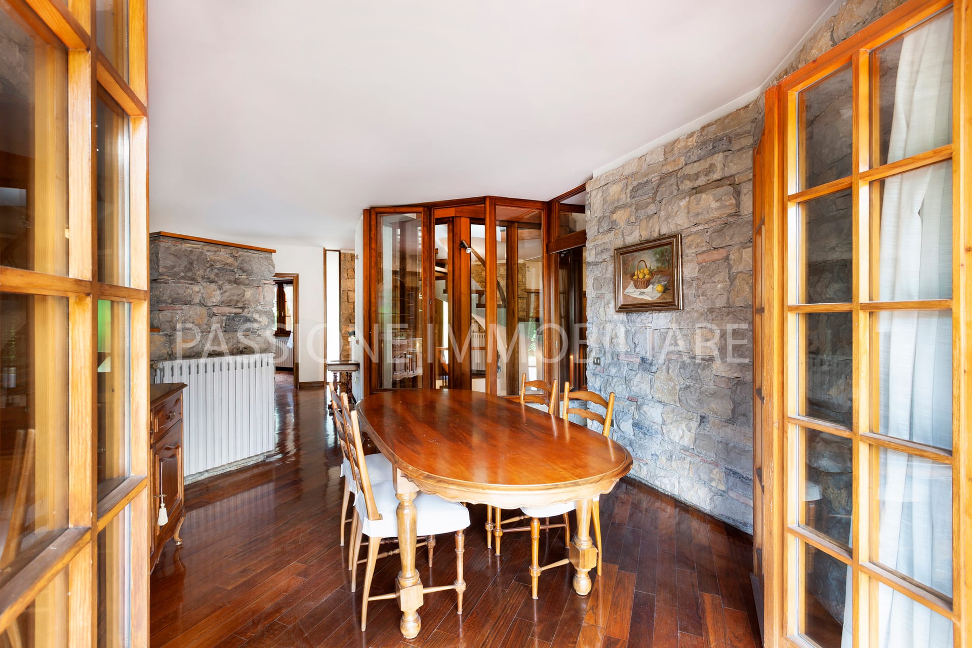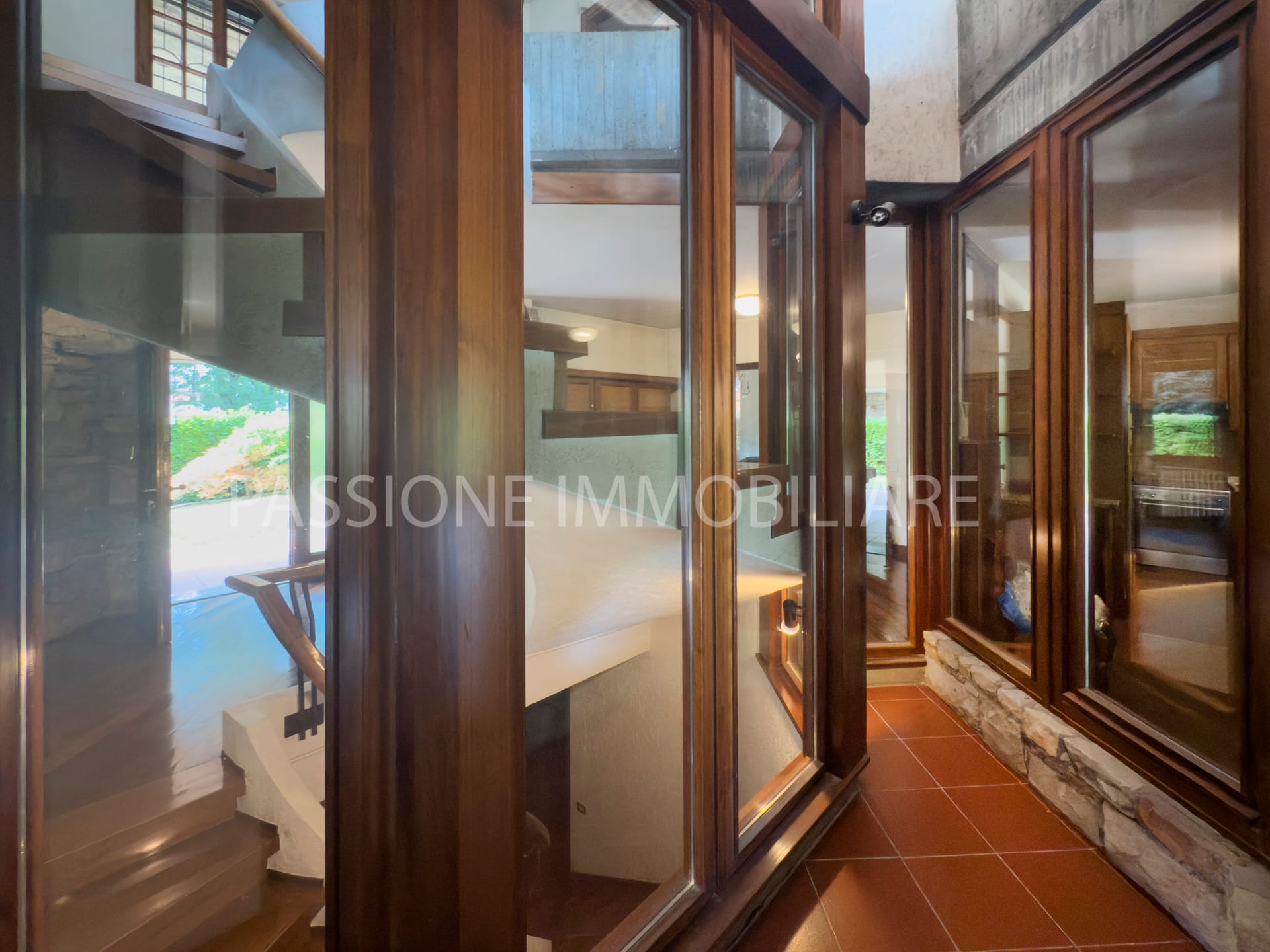 Distribuita su tre livelli, la proprietà è attraversata da una SCENOGRAFICA SCALA IN LEGNO incorniciata da ampie vetrate, che donano una luminosità calda e naturale agli ambienti interni.