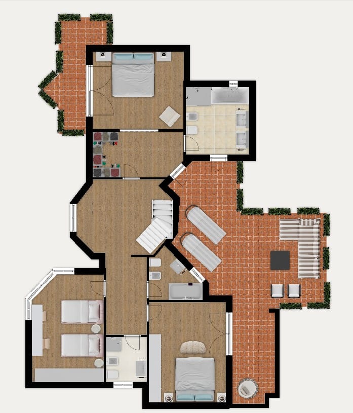 Al piano superiore, la zona notte ospita una raffinata camera padronale con bagno en suite, affiancata da altre due camere matrimoniali, ciascuna servita dal proprio bagno. Il livello è arricchito da un ampio terrazzo con affaccio sul verde, ideale per momenti di relax e contemplazione.